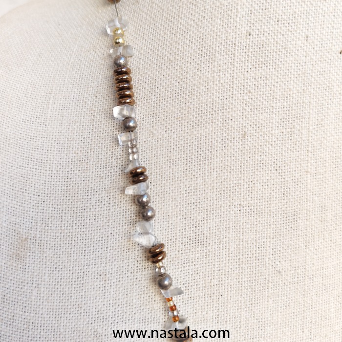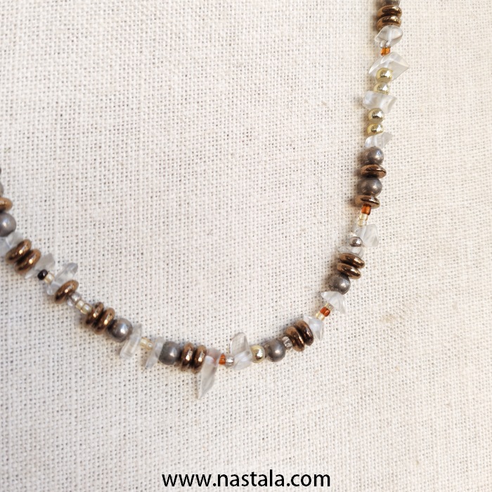 antiqued brass and copper plates connect below the collar.Features an adjustable clasp closure